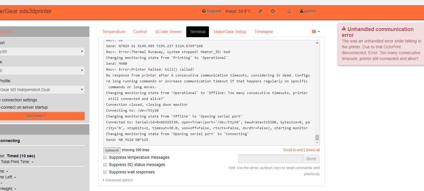 I'm getting a Thermal Runaway on the Heated Bed when I try printing at 110C on the heatbed. It'll go up to 97C without issue, but after about an hour of printing at 110C, the whole thing shuts down. The OctoPrint interface shows disconnected, but pulling up the terminal, I get "Error: Thermal Runaway, system stopped! Heater_ID: bed". Is there something I can check before sending the unit back to MakerGear? In the middle of a major customer print, so really trying to avoid having to send back if possible.