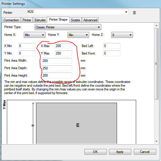 After installing reptier-host (don't worry about repetier-server), first set up your basic settings in Config->Printer Settings (important stuff circled in red):