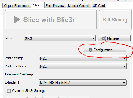 If you imported your settings correctly, you should see 3 drop-down boxes (Print Settings, Printer Settings, Extruder 1) all with "M2E" selected