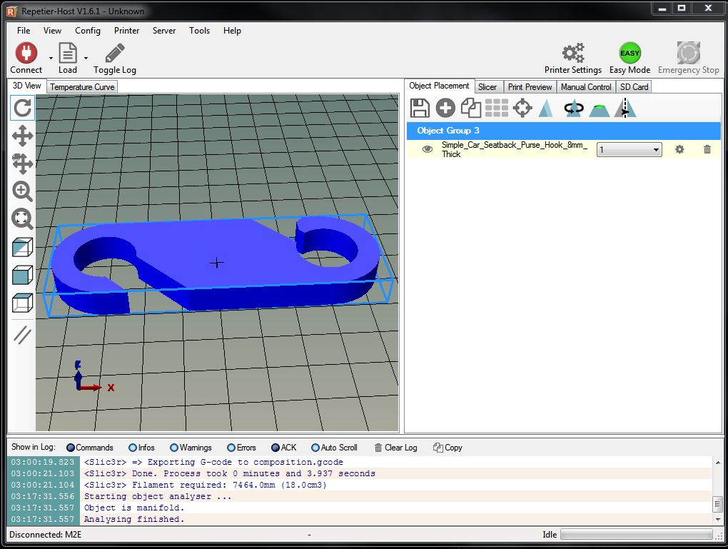Now that I printed some of the Getting started samples (the twisler and the bracelet) successfully, I wanna move on to printing models taken from thingiverse. I tried a simple car bag hook: