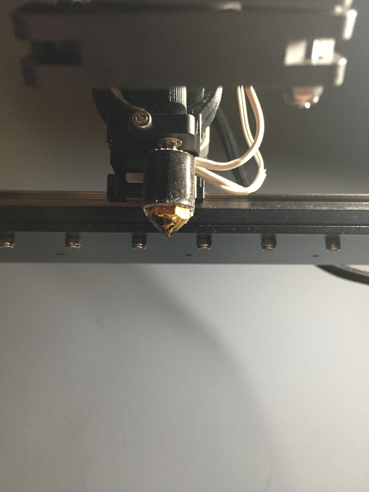 Jules wrote: Turn off the machine. Pull the little black rubbery cloth thing off of the heater block. The thermistor and heater wires need to be sticking out to the right, as you face the machine. If they don't, loosen the screw slightly, without letting the nozzle fall out, and rotate it until they do, and the heater block runs parallel to the metal holder above it. Tighten the screw and put the cover back on.