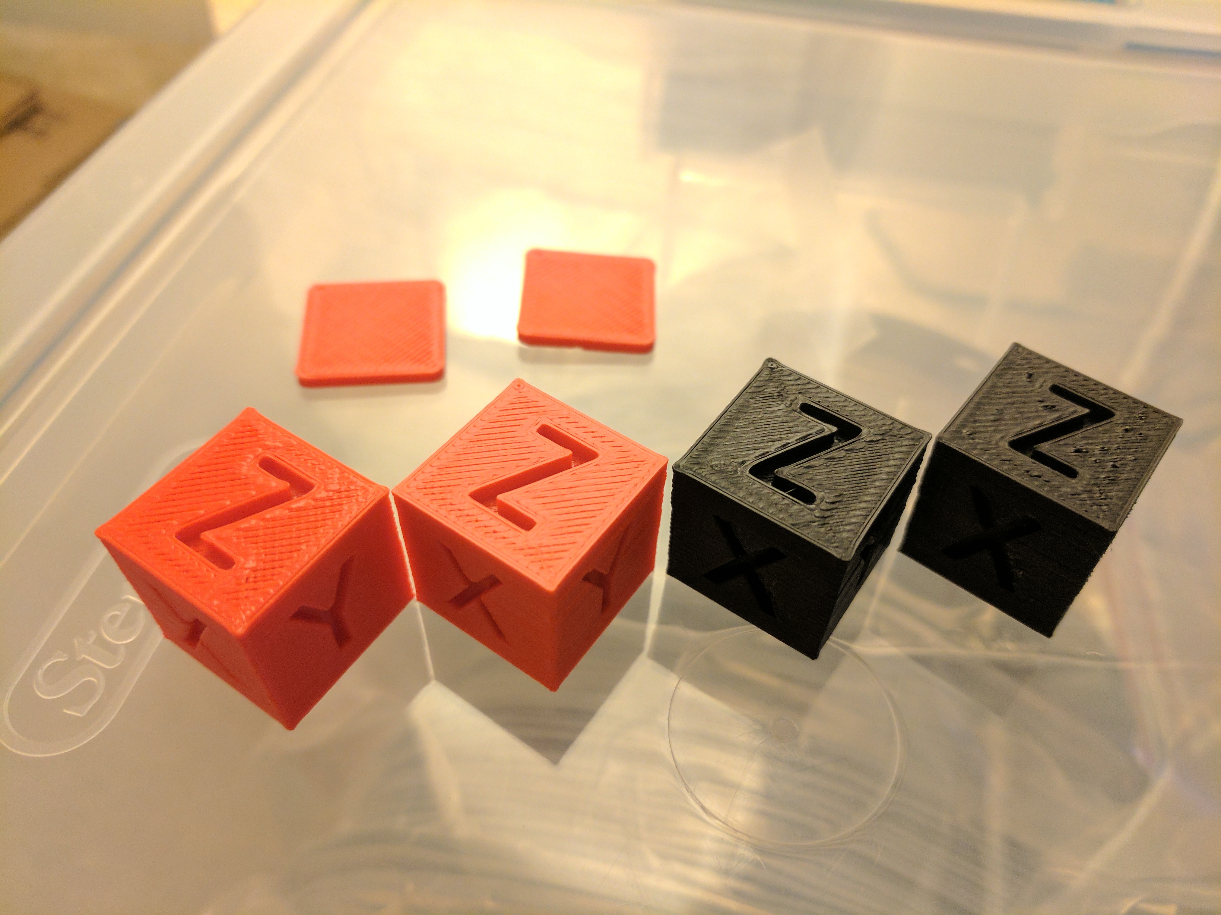 My cubes are measuring ~19.97 on one side and ~20.03 on the other, with height measuring just above or at 20. I printed one block at 0.2mm layer height and one at 0.1mm layer height in each color, but added more top and bottom layers with the red. The smaller squares in the back were testing extrusion multipliers (0.91 and 0.95). The 0.95 was puffier around the overlap but still has the same gap.