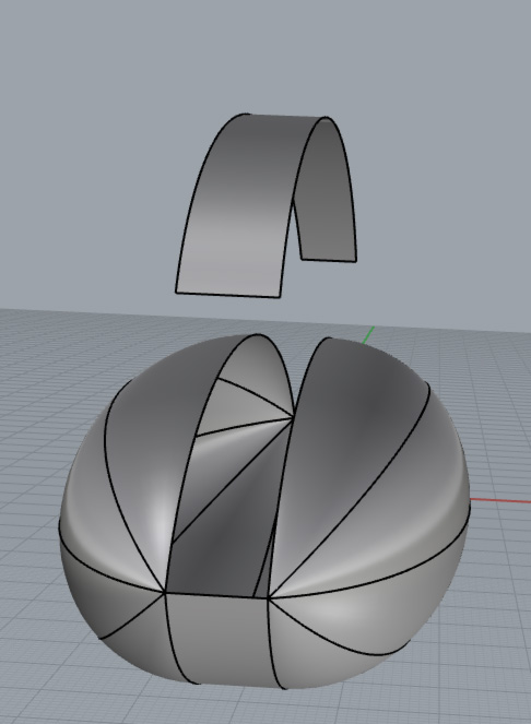 --- If you generate the triangle from Sweep2rails using a Line across the nose and opening the blimp with a 5º taper from the tail, then you can use UnrollSrf to lay the panel flat. You can check for curvature by using a line snapped to the long unrolled point to see the subtle curve created down the long side of the triangle, but this may no be an issue for your application.