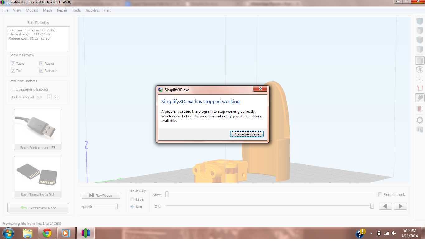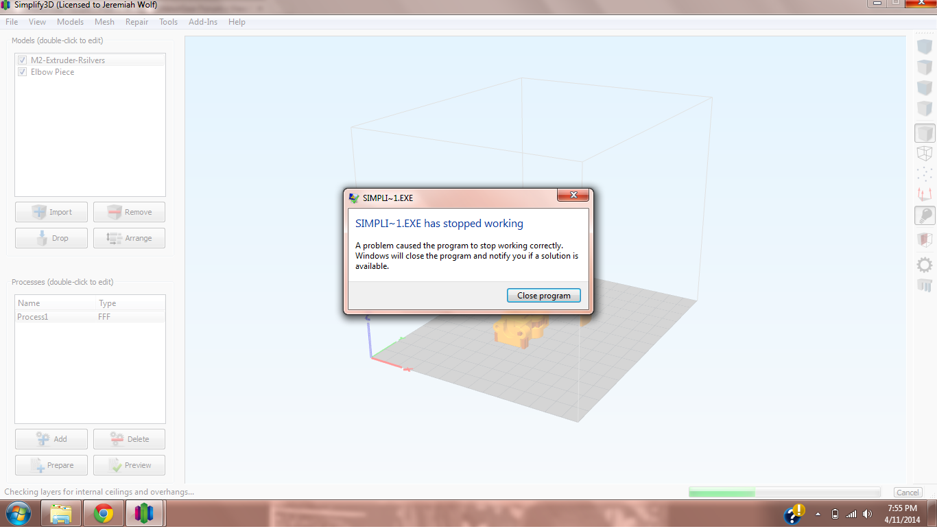 You were right Jim, I uninstalled version 2.0 then re-installed it. I have completely uninstalled everything related to S3D. Then I installed version 2.1, and I am having the exact same problem, after I choose prepare to print the program gets an error and closes. I checked the firewall and there shouldn't be an issue there. I'm not sure whats going on but I have contacted the creators and am waiting for their response. Thanks Jim.