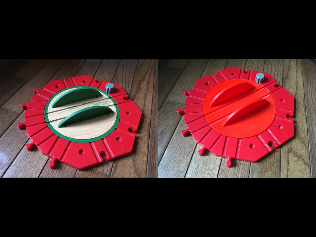 Somehow my son has acquired an enormous volume of Thomas the Tank Engine play sets. One(!) of his roundhouse turntables is missing the track portion. Most fortunately, I had an extra one to copy, or it would have been much work to duplicate the gearing.