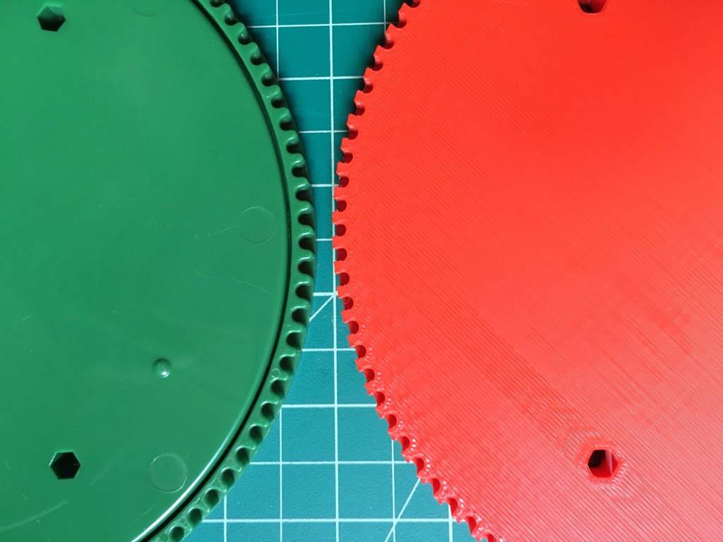 Somehow my son has acquired an enormous volume of Thomas the Tank Engine play sets. One(!) of his roundhouse turntables is missing the track portion. Most fortunately, I had an extra one to copy, or it would have been much work to duplicate the gearing.