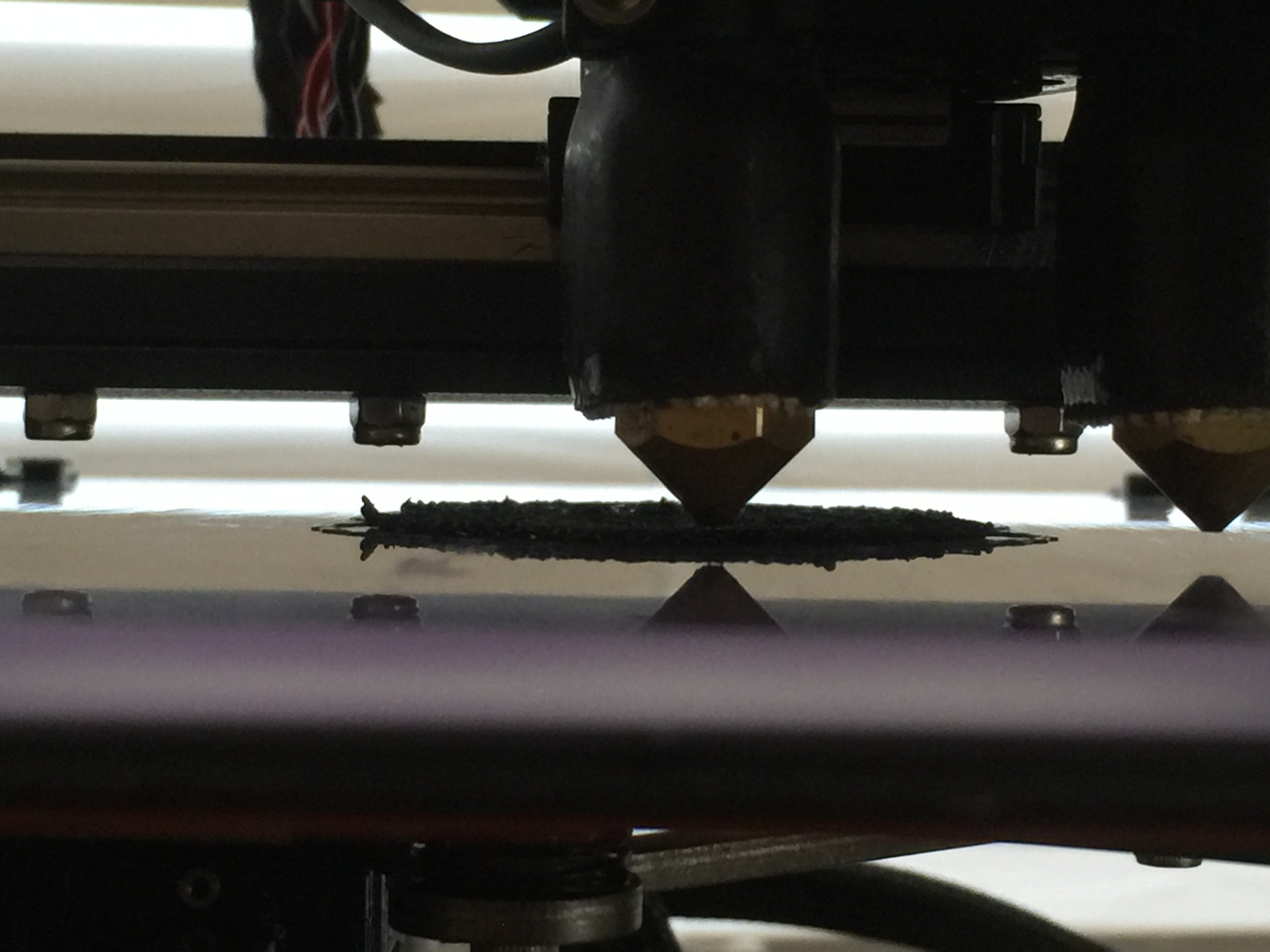 And it looks like your nozzle is either too close, or too far away from the plate - it's hard to tell with that picture. Those threads are either squashed flat and squeezing out the sides because there is no place for them to go, or the print is warping up and the filament is hitting on one of the nozzles. (Which means it's not set correctly.)