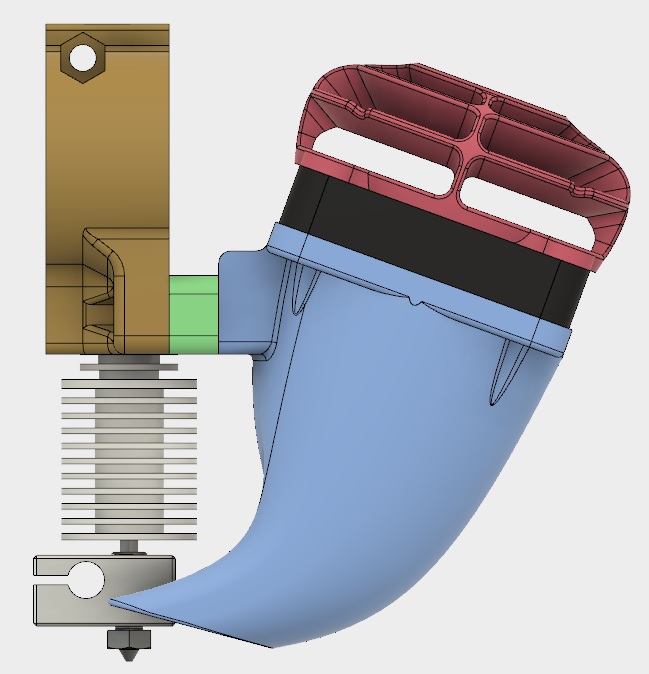 Finished the attachment design and fan guard. Mounting bar (green) is held to the extruder mount (brown) by two machine screws. Duct (blue) attached by means of a dove-tail tab. Should be easy and quick to install/remove. Fan guard is a new design intended to reduce noise level and improve airflow. I plan to use the E3D provided heat-break fan and shroud (not shown) oriented with the fan to the side or rear.