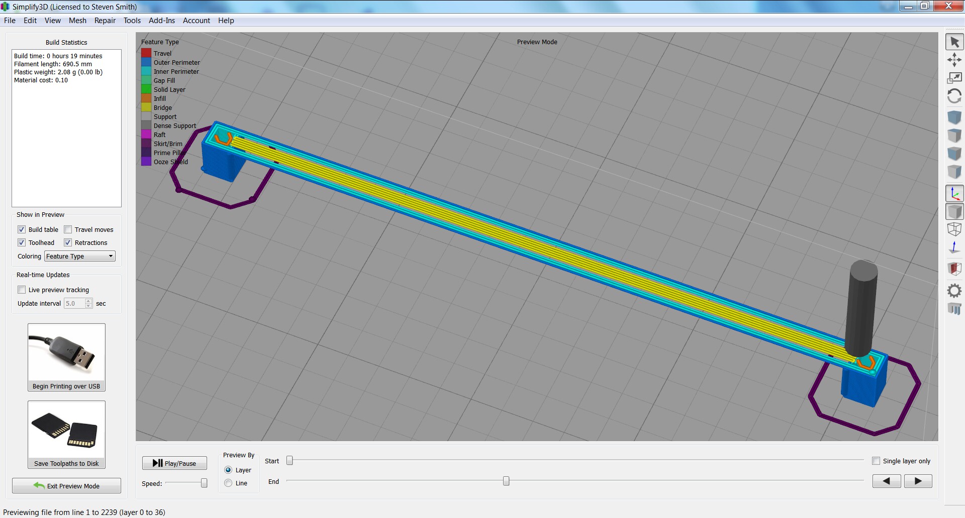I've printed a bunch of tests and learned an important lesson about S3D. It turns out that S3D still uses its perimeter speed settings even when bridging, so those need to be adjusted also. Here is a screen shot of that showing the outer parts of the bridge printing as perimeters and the inner part as a bridge. As it turns out, the model I printed originally had bridges so thin that only the perimeter settings were being used anyway!