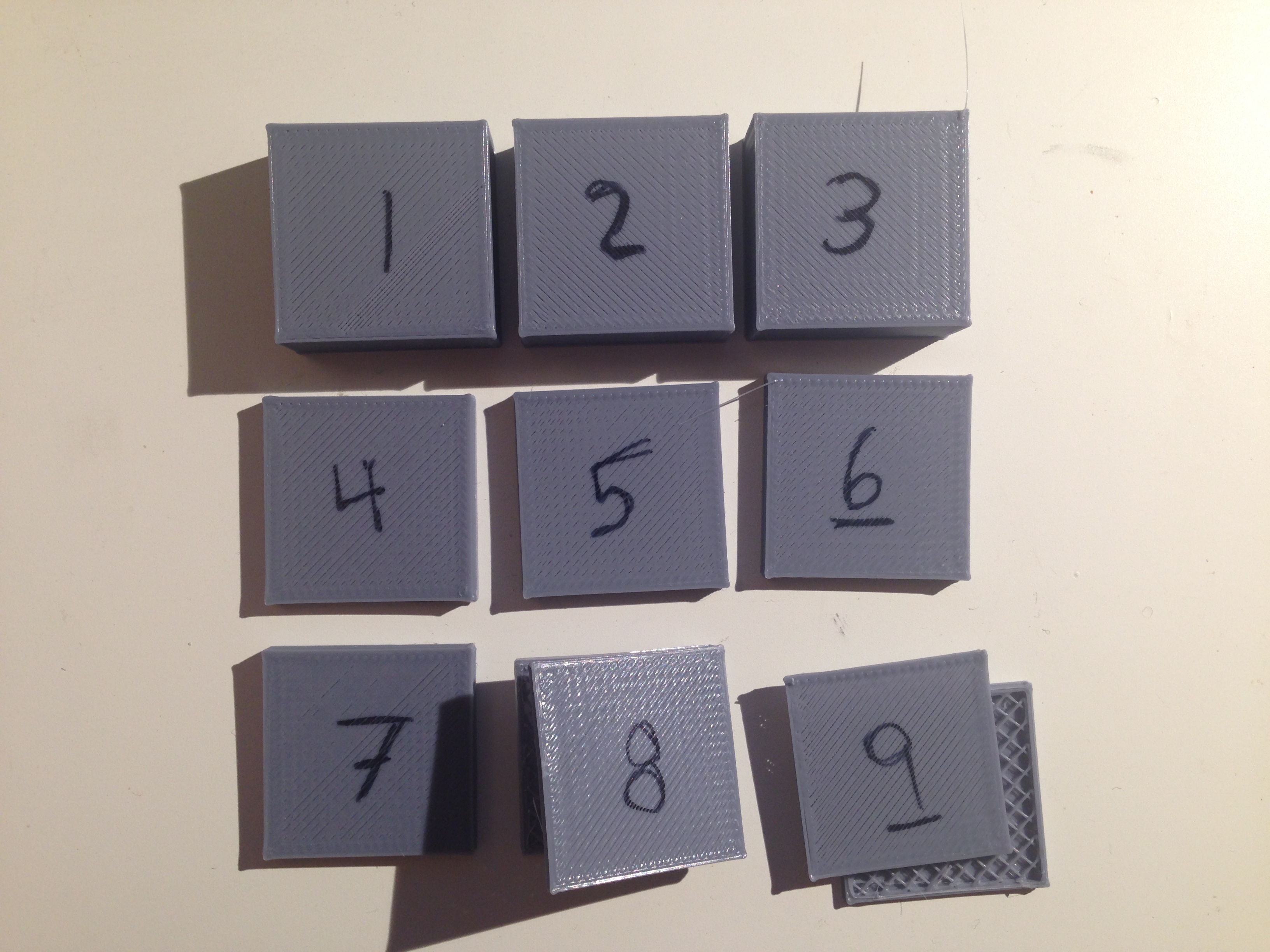 More cubes. This time I adjusted the filament diameter down, starting with the actual measurement of 1.74mm. 1-3 I dropped it .01mm each cube. Not noticing much difference, I ran 4-6, and then 7-9 at .02mm increments (but reduced my overall height from 10mm to 3mm for faster testing). #9 was set for 1.58mm filament. Virtually no change in the top finish if it's hard to tell, and X/Y dimensions on 1-7 are identical - 7's sidewalls were kinda wonky, but 8 and 9 looked pretty bad and were barely holding on, both popping in halves as I took them off the bed.
