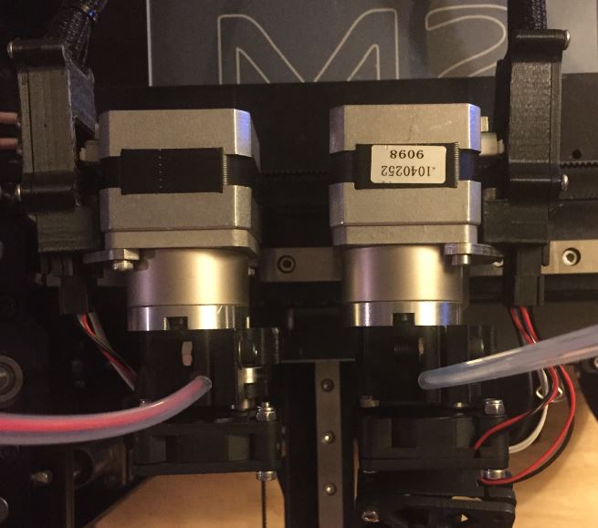 But the only thing I was concerned about when you first said you were going to try this idea with the E3Dv6 hot-ends was the ability for the left extruder to park off of the left side and for the right extruder to park off the right side, and you appear to have those covered. You might want to model the corner brackets around the heated bed plate, mainly the front left one, because I had issues with that corner bracket hitting the wiper on the left parking plate, which is why I don't have a wiper on that side. It can be done, but I haven't gotten around to it, and I'm still evaluating the wiper on the right side, which isn't as useful as I was expecting it to be. In my 2-color 8-sided die test print, the blue filament (left side, no wiper) was better behaved than the white filament (right side with wiper), but that wasn't a very balanced experiment.