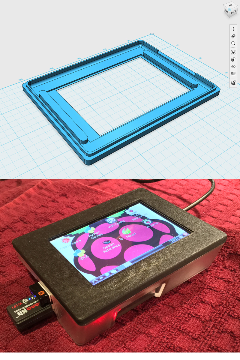 OK, second... one of the reasons I bought a 3D printer was to design and print custom enclosures for projects that I've been developing. One of the projects uses a Raspberry Pi with an LCD touch screen, and an enclosure was available for a 2.8" LCD touchscreen. I wanted to redesign the lid of the enclosure to accommodate a larger 3.5" LCD touchscreen. I used 123Design for the CAD, and Simplify3D to drive the printer. I'm pretty satisfied with the result: