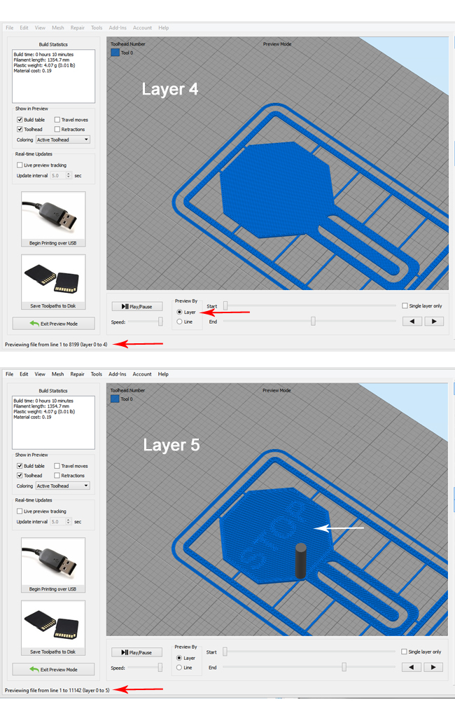 Make note of Layer 5, that's the last solid top layer for the body, (you'll start to see the text). You will want to insert the pause code for the color change 1 layer higher. (Layer 6).