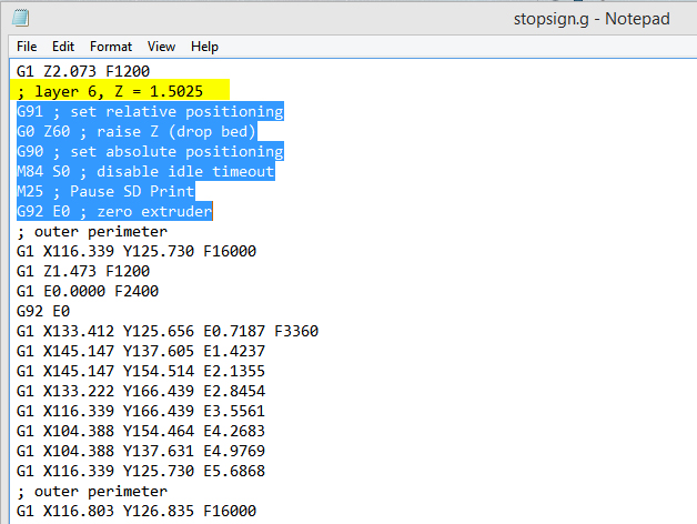It should be mentioned if your are running through Octopi... you need to replace the "M25" command with "M0" to get the pause to work correctly.