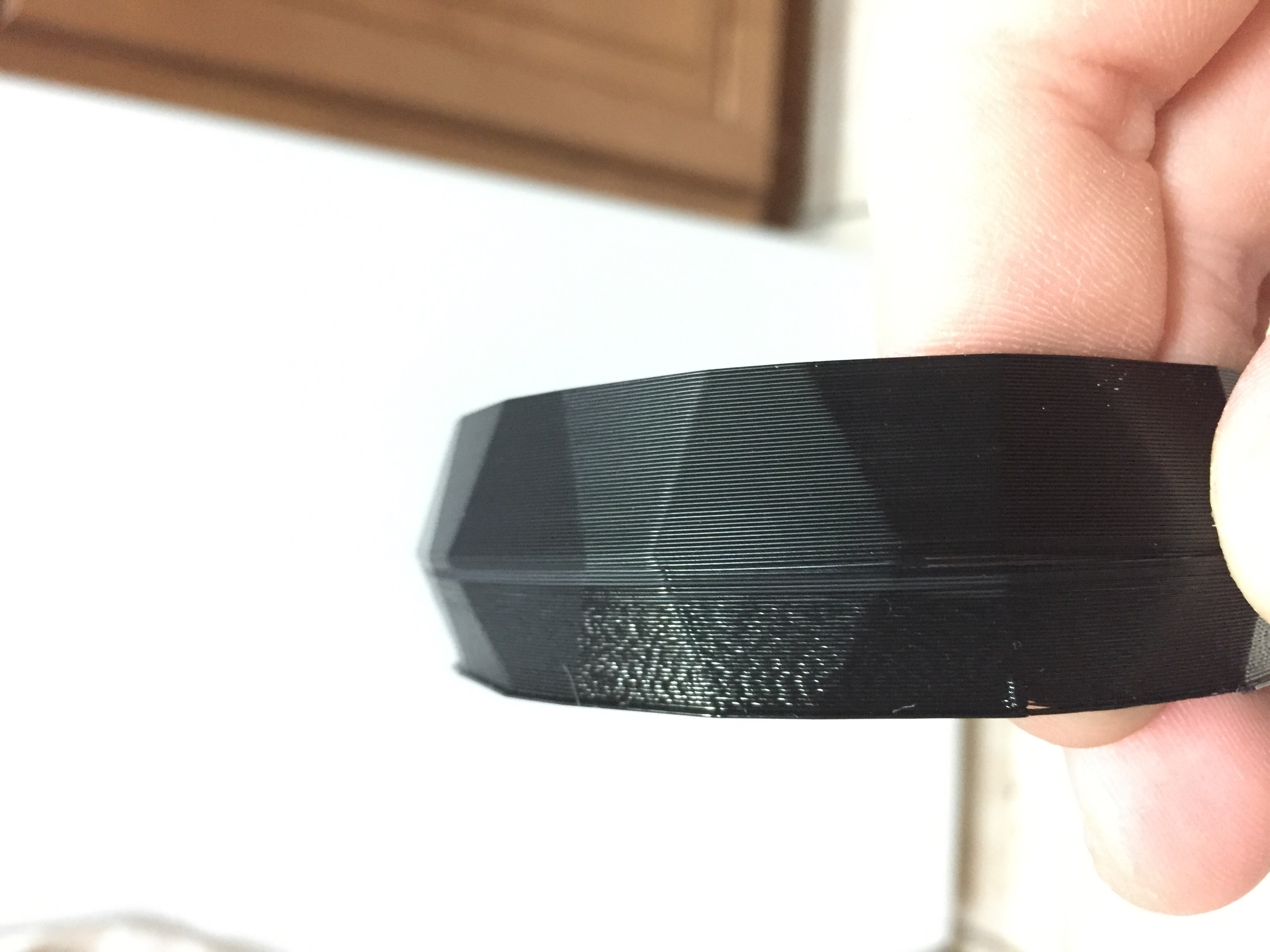 I printed the maker gear bracelet again and noticed that the first several layers appear more melted then the upper layers. The top half of the bracelet came out fantastic. Is the lower half supposed to be smaller in height then the upper half or is it smaller because of the over heated/melted look I'm seeing?
