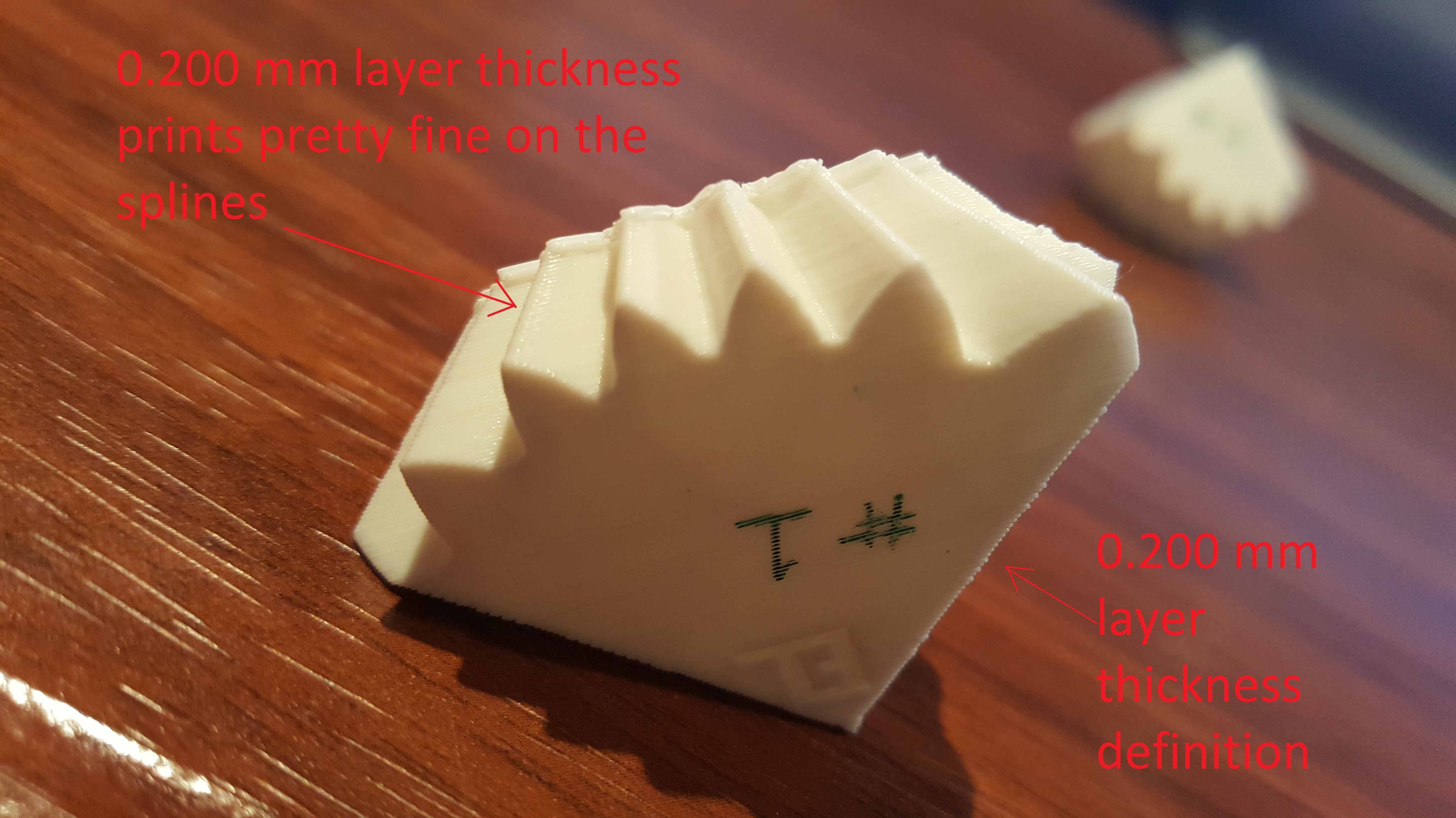 I did the second print using a 0.100 mm layer. While I can see the higher resolution on the edge of the part, it seems all the points of the splines had issues during the print (attached pictures show the difference). What I think is that the layer is so thin on that point of the spline, that it is unable to stay stick on the underneath layer. The nozzle, going pretty fast, kind of resets the warped points every it passes over them; thus giving me that bad result on those splines.